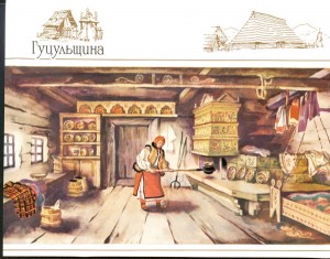 Во внутренней среде гуцульского дома деревянные не беленые стены , мебель, посуда и другие предметы украшены резьбой и выжиганием, печь с камином украшена кафелем , кровать покрыта рядном или покрывалом. На стене — иконы на стекле, рядом подвешены початки кукурузы, засушенные травы, яйца. И в одном и в другом интерьере ощущается гармоничная слаженность»орнаментально-песенного ритма «, единение ансамбля с природой, как неделимой части природы.